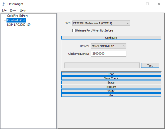 The Flash Insight Kinetis EzPort programmer provides read, blank check, erase, program, verify, and run operations on Kinetis devices that support the EzPort interface.