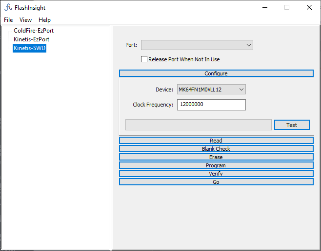 The Flash Insight Kinetis SWD programmer provides read, blank check, erase, program, verify, and run operations on all supported Kinetis devices.