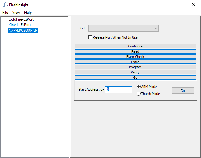 The Flash Insight NXP LPC2000 ISP programmer provides read, blank check, erase, program, verify, and run operations on LPC2000 Family Devices.